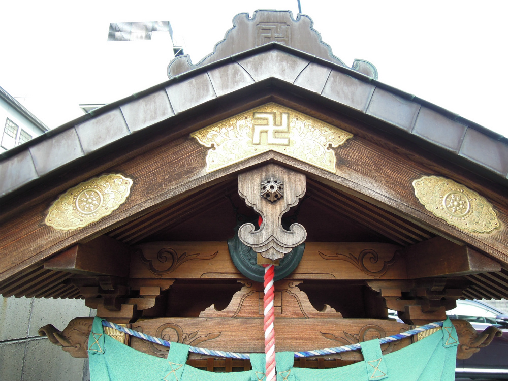 金に光る祠の金具に、エメラルド・グリーンというかターコイズ・ブルーというか、とにかく綺麗な色の幕が中々良い感じ。そこへの刺し色は消火器ボックスの赤です。