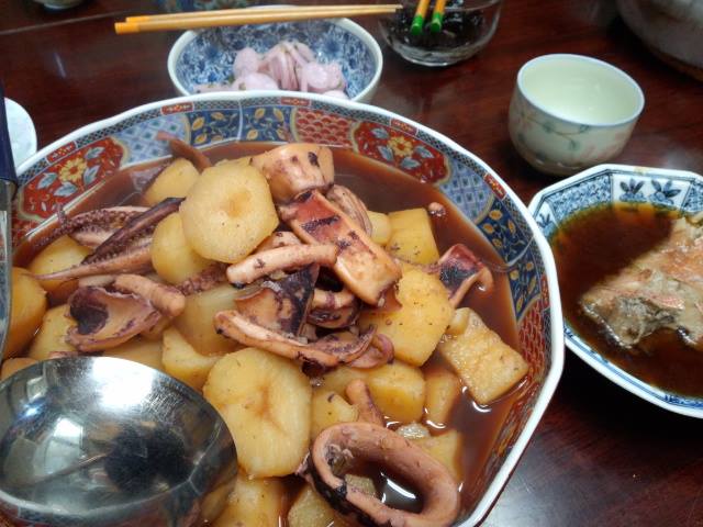 京都の織屋の賄いは、イカとじゃがいも、大根を炊いたん。土曜日の赤魚がぷるっぷるの煮凝りになっていました♡