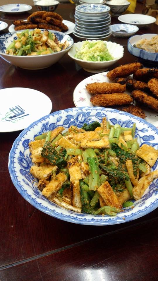 今日の西陣の織屋の賄い。小松菜とお揚げさんの胡麻和え、奥がからし和え。 ちよっと焦がしてしもうたメンチカツ。