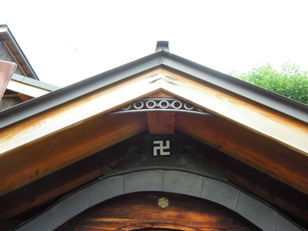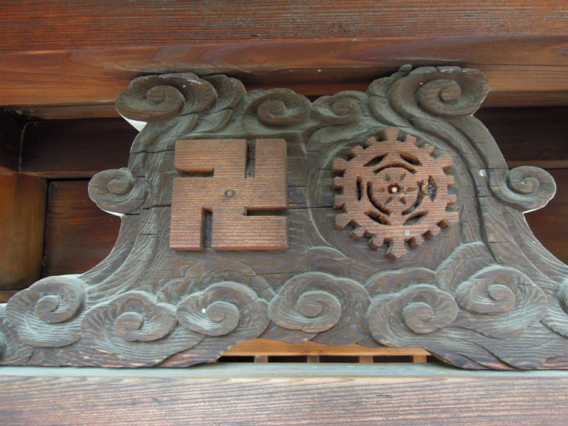 湧き上がる雲に「卍」と「輪宝」の木彫り。