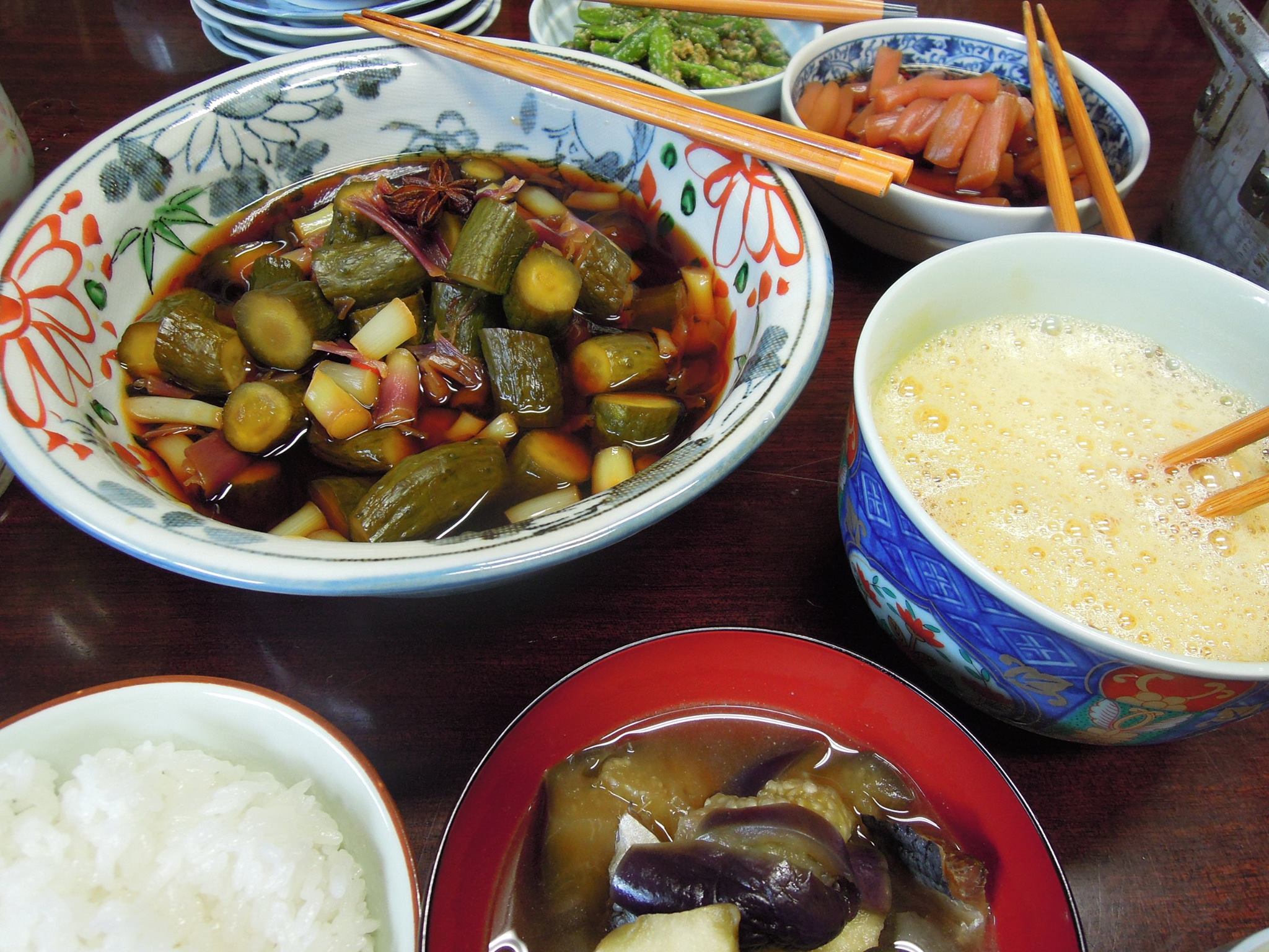 織屋の賄いは、間引ききゅうりで中華風キュウリ漬け、なすニシン、みょうが納豆等々でした。