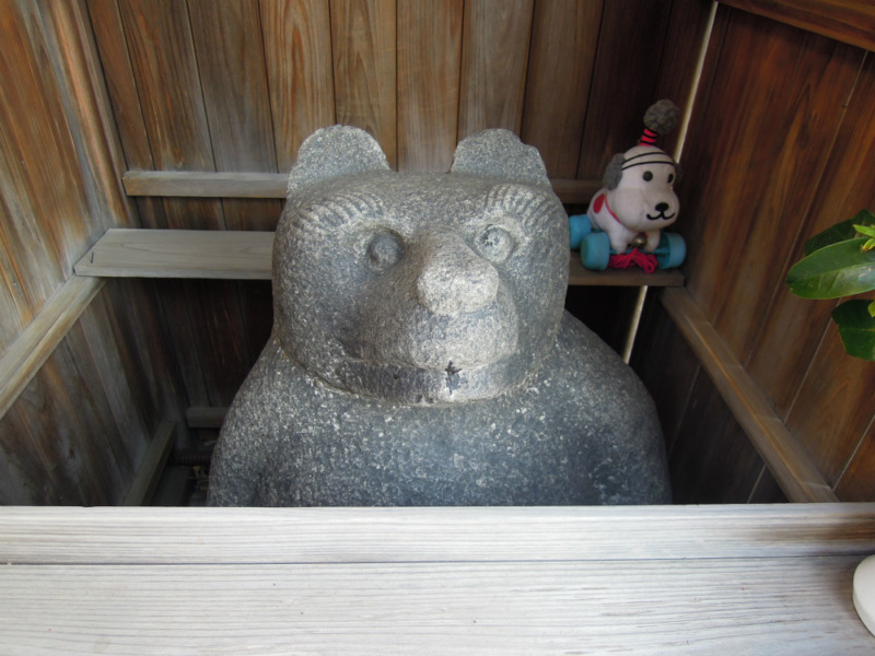 あらっ。思ったよりも大きい狸像でした。少し上を向いているお顔と太目のまゆげ、とぼけた雰囲気がとても可愛らしい明神様。