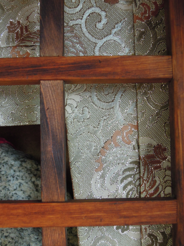 金襴発見。すでに銀欄になっています。アルミ箔でしょう。桐唐草に鳳凰紋じゃないかしら。