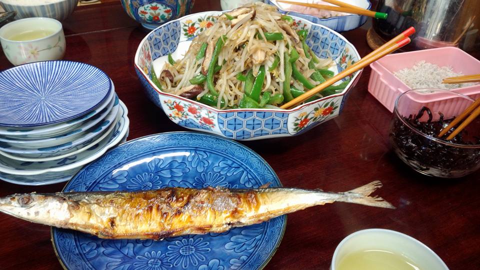 今日の織屋の賄いは、さんまの塩焼き、もやしを炒めたんでした。