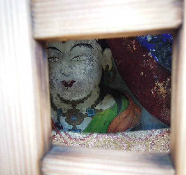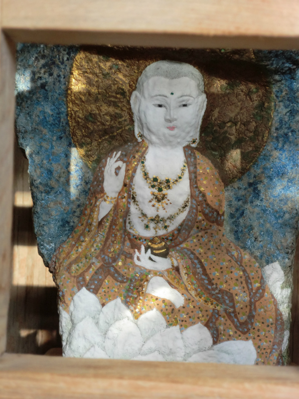 このお地蔵さん。トルコ石のような色合いを背景に蓮台に乗り、華奢で素敵です。いいお顔です。綺麗なお袈裟をお召しになられていますね。
