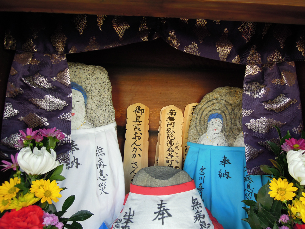 さて、岡本織物、日々、巷で使われている金襴を探して日々彷徨っております。しかし、金襴と言うのは晴れの日の装飾布。中々お目にかかりません。お地蔵さんを拝見しているうちにお地蔵さんの面白さに、惹かれてしまいました。でも、今日のお地蔵さんに金襴が掛かっています。嬉しい。