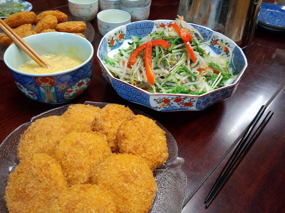今日の京都の織屋の賄いは、かぼちゃとチーズのコロッケ。もやしと水菜の和え物でした。
