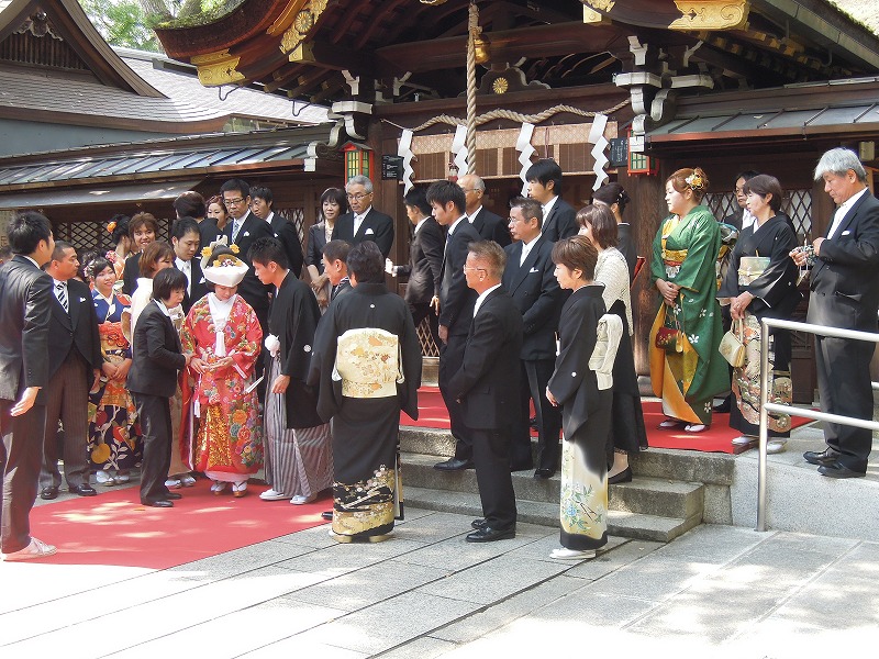 ぶらぶらと散歩がてら近くの神社「護王神社」へ行きました。まあ。綺麗。神前婚の最中です。花嫁さん綺麗ですね~。