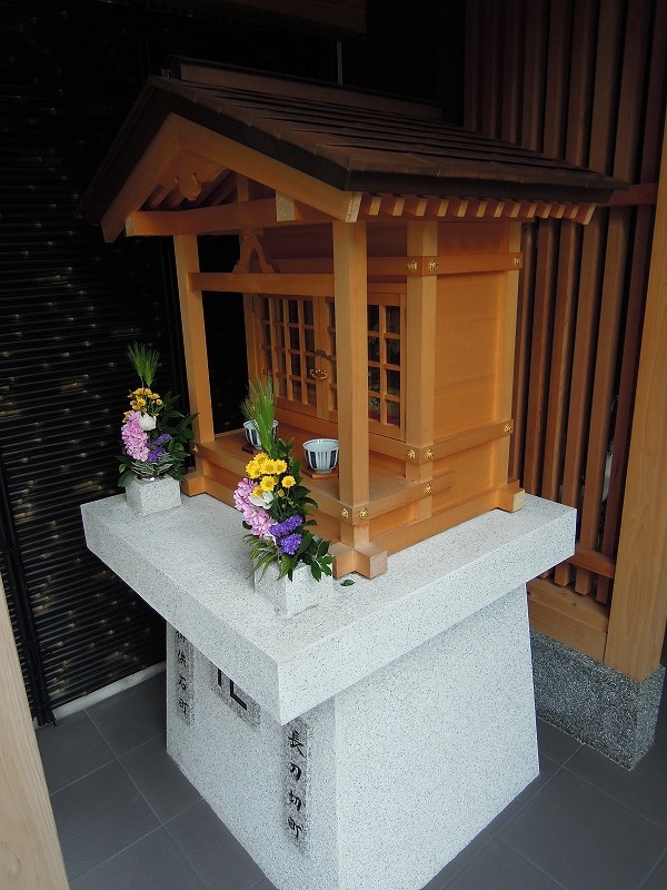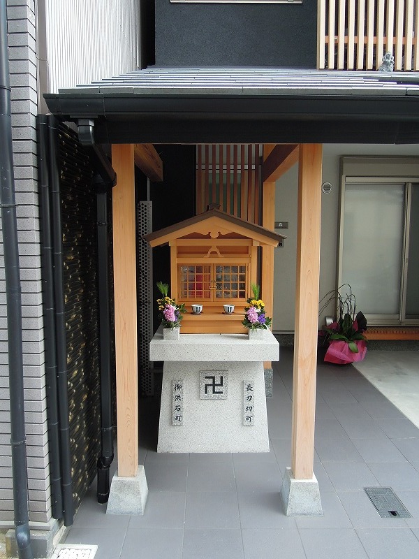 万寿寺通りは東西を通る道です。樋口小路と平安時代は呼ばれていたそうです。北に松原通り、南に五条通り。その間の道です。普通のお宅の玄関先に鎮座してました。