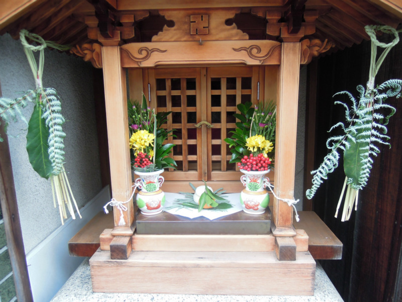 小さいお鏡さんだからこのように飾ってはるのでしょうか。裏白を敷いて、お鏡さん。上に載せずに前にゆずりはを置いてその上に葉付きみかん。確かに上に置いたらころころしてしまうかもしれませんね。