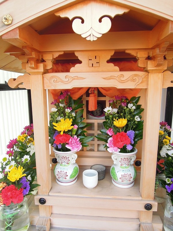 あら、白木も清々しい新築っぽい祠。お花も沢山で明るいですね。