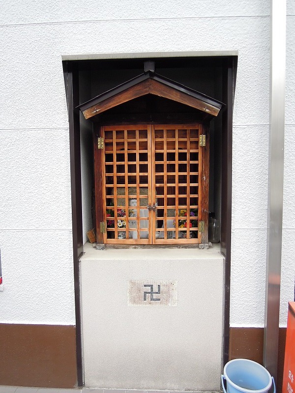 マンションの壁面に埋まっています。計画的建築です。最初からお地蔵さんが組み込まれているって素敵です。