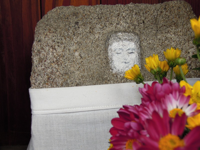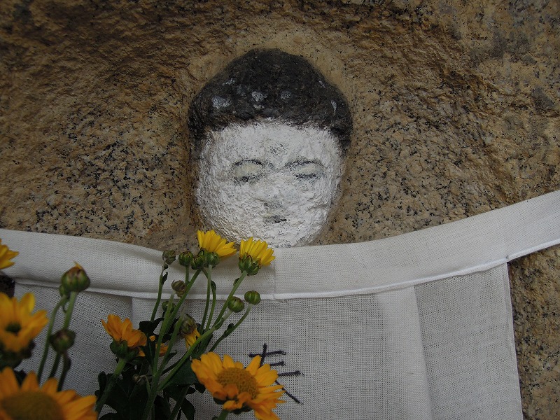 白塗りの御地蔵様。とても穏やかなお顔ですね。お花も生き生き☆