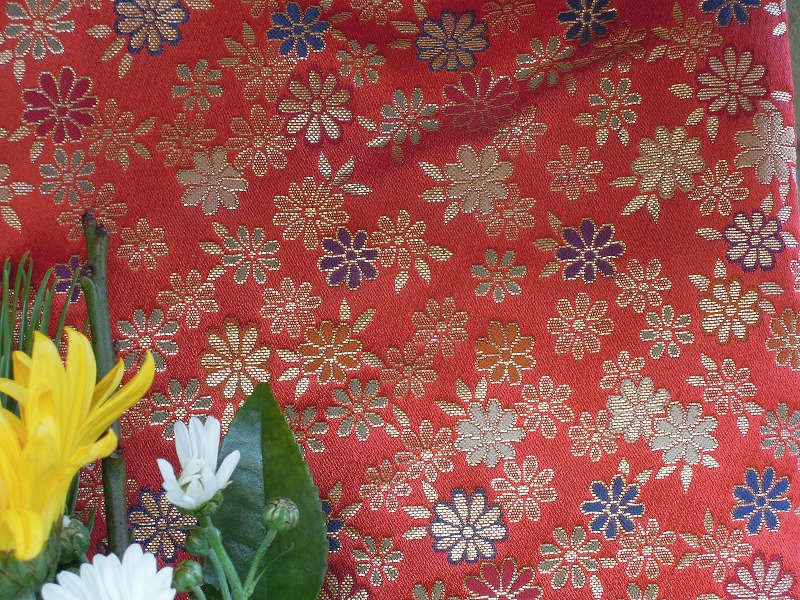 菊散し紋様の朱色の金襴地。菊かなあ。小花って言った方がいいかしら。