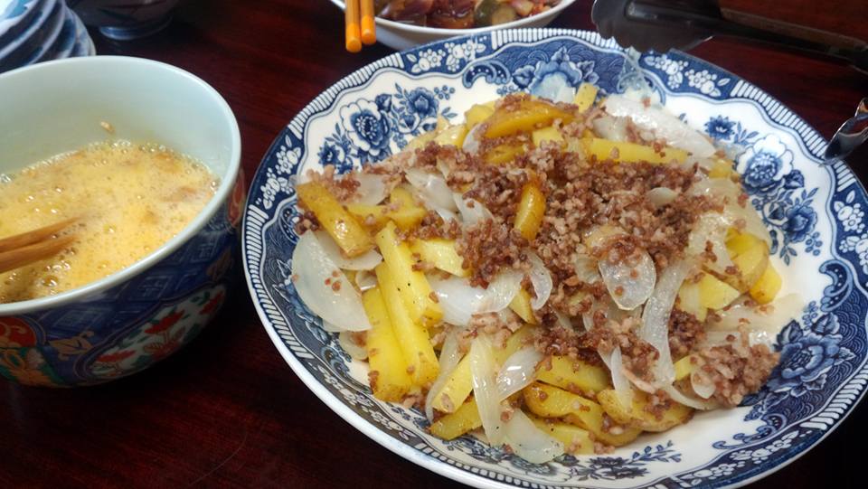 今日の織屋の賄いは、豚挽き肉とじゃがいも、玉ねぎ炒め、その他諸々でした。
