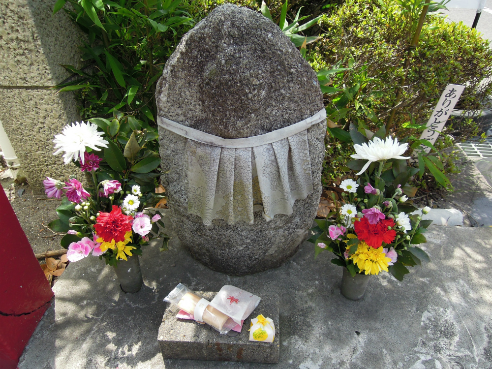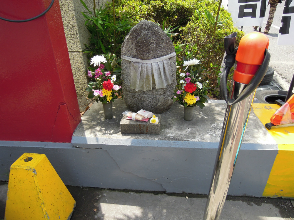 おべべは地味ですが、お供え物も沢山あって賑やかなお地蔵さん。ガソリンスタンドになる前はどのような感じでいはったんでしょう。古い感じの石仏です。