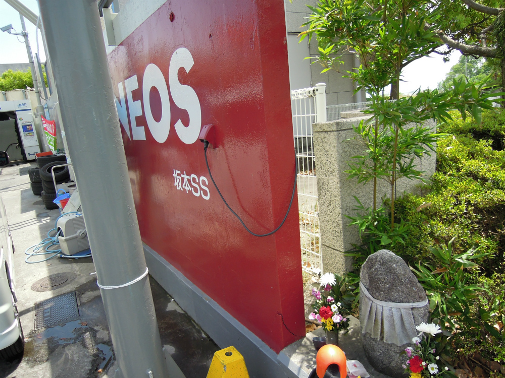 ガソリンスタンドENEOSの傍らにお地蔵さんがいはりました。ENEOSの向こう側は琵琶湖です。