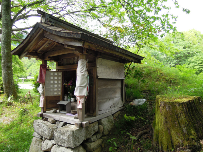 千社札が沢山貼ってあります。あ、この祠も障子が貼ってあります。裏はこうなってたんだ~。