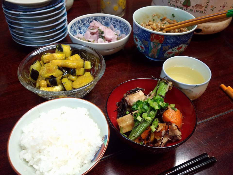 今日の織屋の賄いは、かしわ、破竹、切り干し大根、アラメなんかを炊いたもん。西賀茂の振り売りが来てくれはったので急遽なすの辛し和えを作りました。