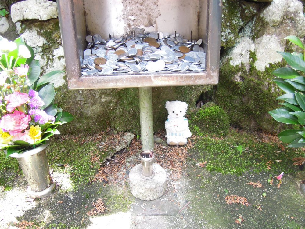 蝋燭台には小銭が沢山。下に可愛らしい熊さんがいはります。
