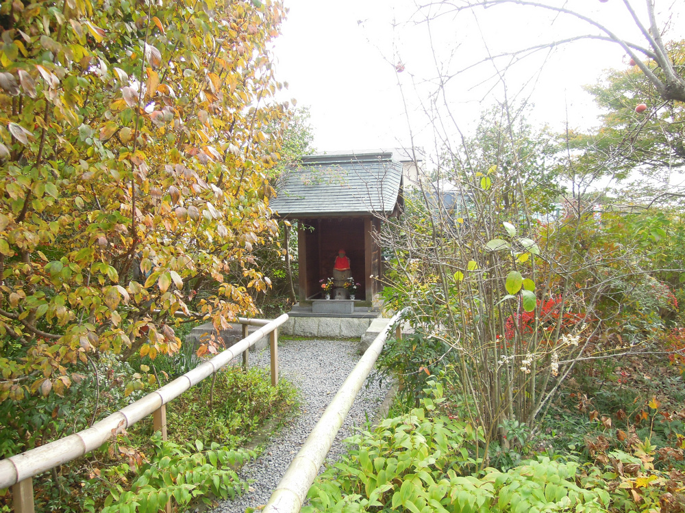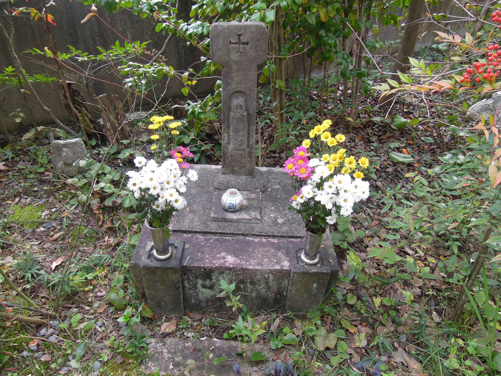 私が気になっていた小道をちょっと東に曲がったところには、このような石仏が。仏?ではありませんね。クリスチャンの神像です。こちらは本堂を建て替えたときに出てきたそうです。由来は不明。京都、関西は昔からクリスチャンが多いでしょうし、隠れキリシタンのような悲しい歴史もあると思いますのでこの十字架を見たときに軽く動揺しました。どのような歴史をご覧になってきたのでしょう。