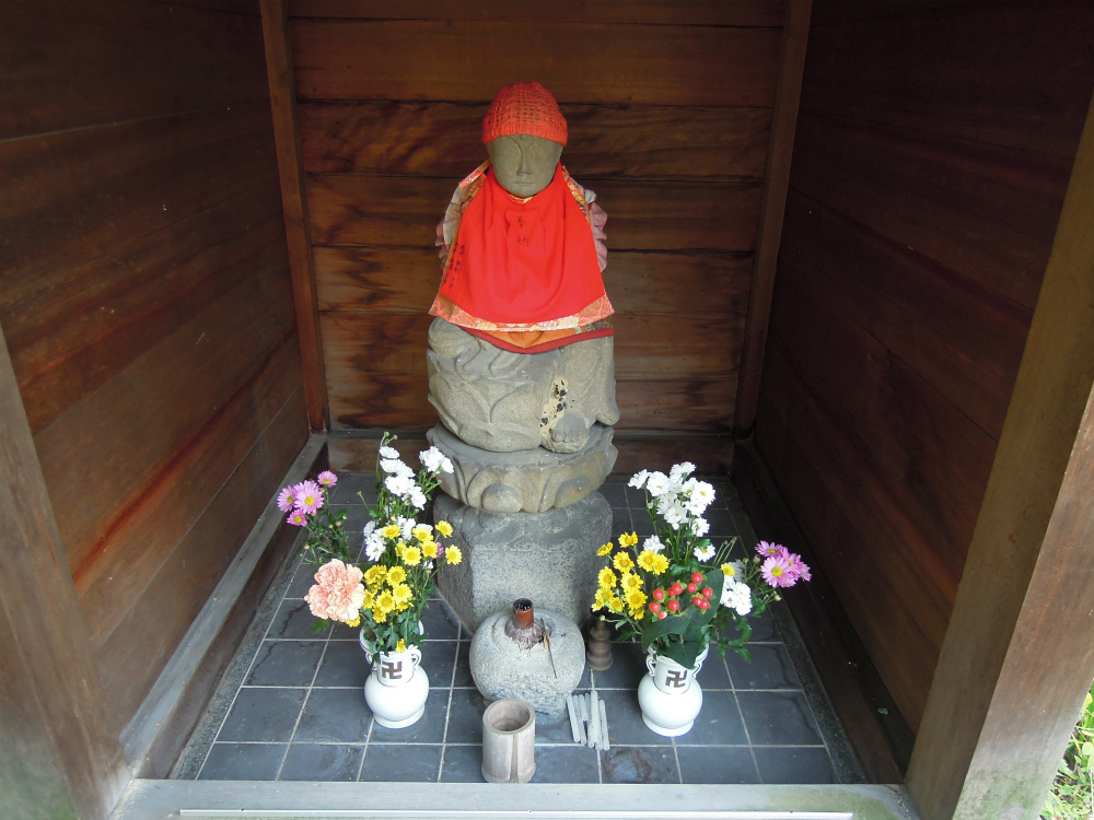 赤いおべべが可愛らしいお地蔵さん。手編みの赤いお帽子も配慮を感じます。