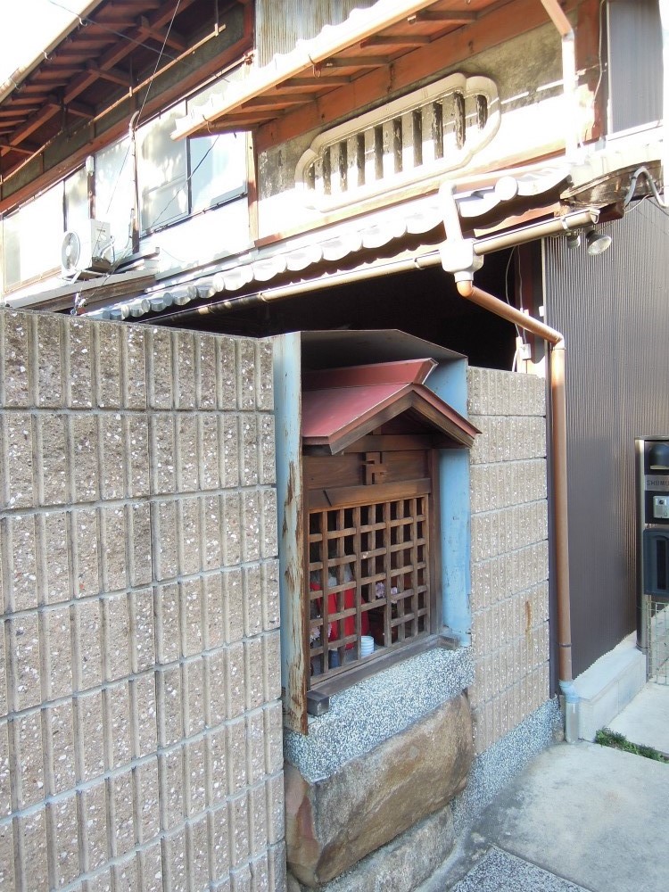 不思議なんです。この写真で言いますとこちらのお地蔵さんは右手の家を向いてはるので右手のお宅のお地蔵さんなのかと思うのですが、どう考えても敷地の大部分は左手のお宅にめりこんでいます。なので、敷地的には左手のお宅のお地蔵さんなのでは(門柱の手前に位置していますが)?と思うのですが・・・。こういうお地蔵さんの場合、所有は一体どなたなのでしょうか。それとも町内のものなのかしら・・・。