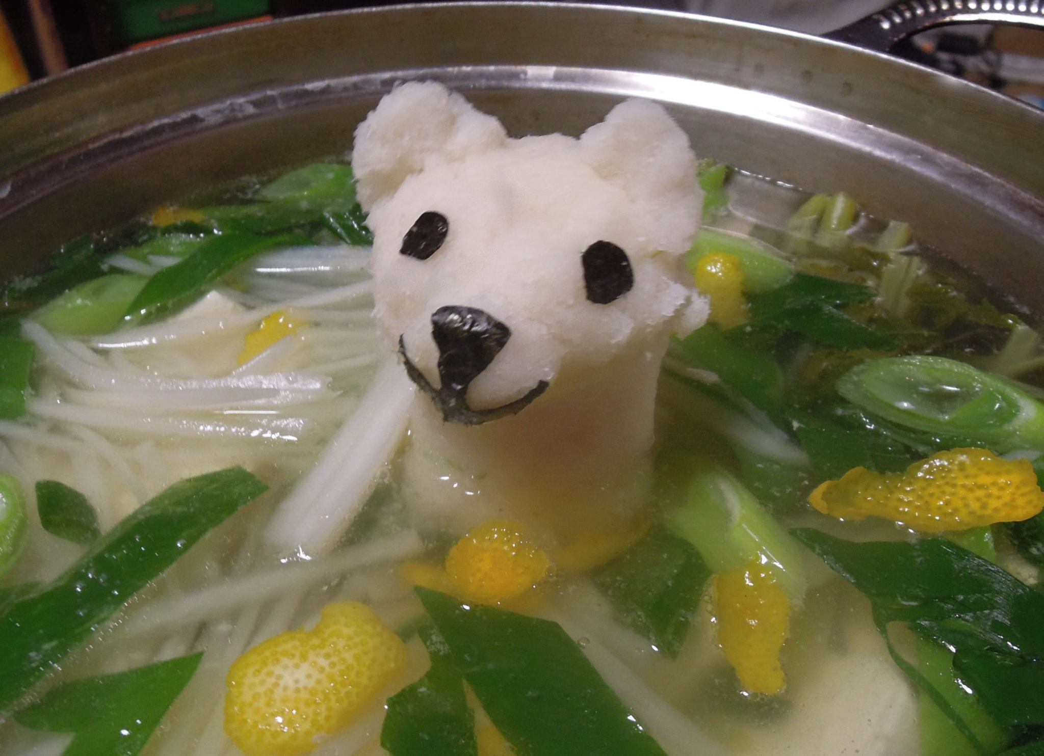 こんにちは。京都の西陣で金襴と言う織物を織って口に糊をしている岡本織物です。めっきりと寒くなりましたね。皆様、お風邪など召しませぬようご自愛下さいませ。そんな寒い夜には温かい鍋を頂きました。SNSで拝見した「白熊ちゃんみぞれ鍋」をしてみたくなりまして、シロクマちゃん柚子たっぷりみぞれ鍋をして昨夜はほかほかと温まりました。冬の幸せ♡