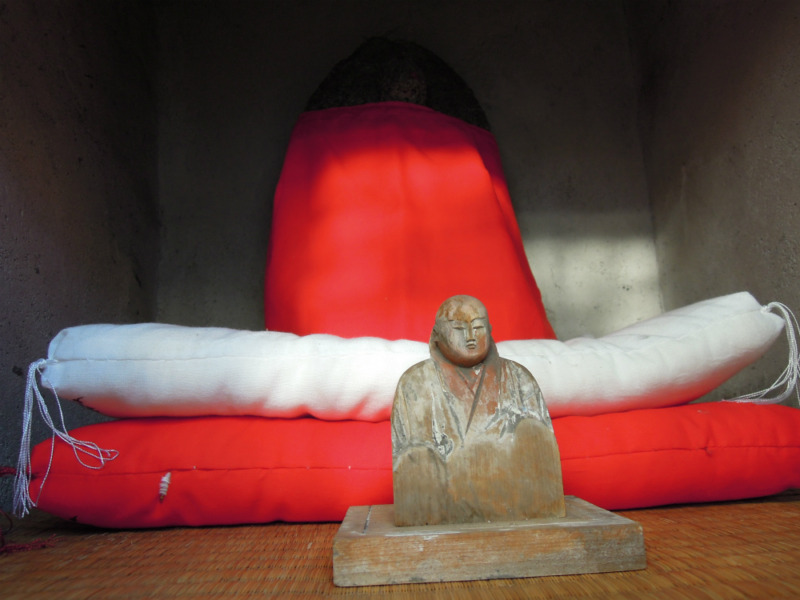 こちらの祠の中には木彫のお坊さん像と石造りのお地蔵さんが重畳ではなくて重座布団に乗ってはります。紅白ってほんまに目出度い色ですね。灰色の祠の中に紅白の色。