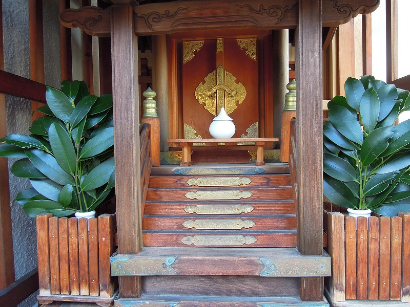 日本の家庭にはたいてい「仏壇」と「神棚」が一緒に存在しているのですが、このように社屋の玄関前に2つ並んでいるのはなんとなく珍しい気がします。どちらも商売繁盛に大事