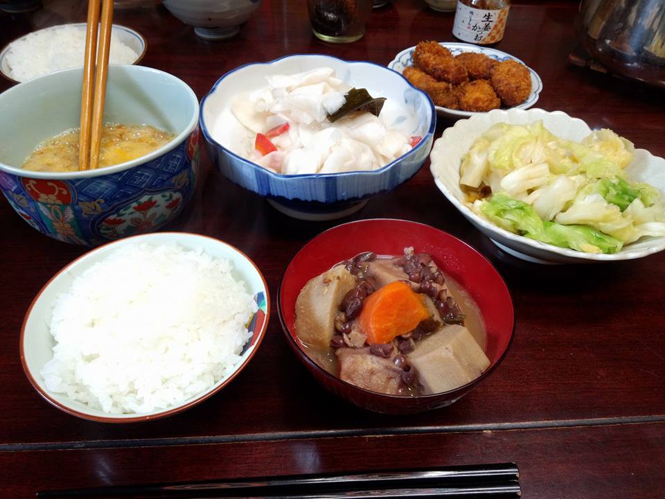 今日の織屋の賄いは、いとこ煮でした。具は海老芋、人参さん、ごんぼさん、かしわ、高野豆腐、小豆。漬物は、あちゃら漬けと、キャベツの塩もみ。