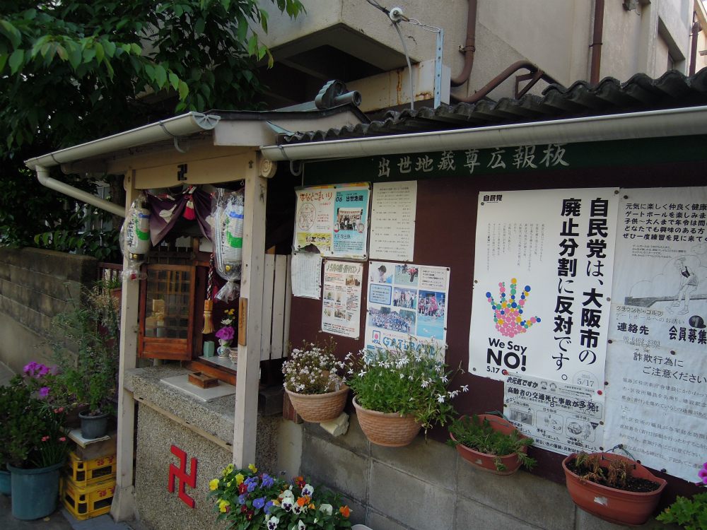 懐かしいポスターが貼られていますね。大阪都構想の住民投票の寸前のことでございました。しかし「出世地蔵尊広報版」という掲示板が良い感じです。