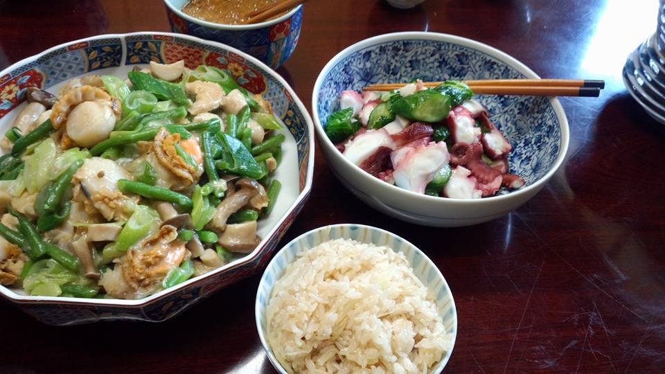 今日の織屋の賄いは、新ショウガをたっぷり千六本で炊き込んだ生姜飯、蛸と蛇腹きゅうりの酢の物、ホタテの野菜あんかけでした。ホタテを炒めたらやたらと水が出てスープになってしまったので急遽あんかけに変身。
