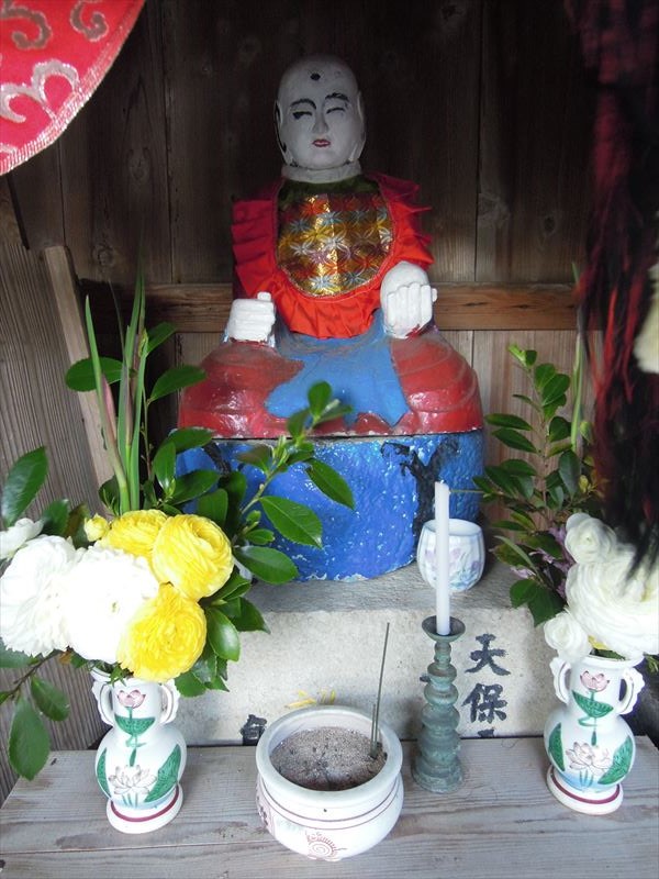 お隣のお地蔵さんも派手ですね。個性的なお顔立ち。金襴というか帯地だと思われる布に派手なフリルのおべべです。