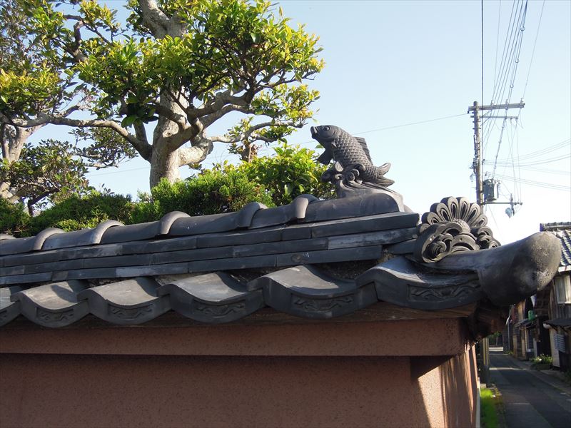 この瓦は近くにあったお宅の瓦です。「さすが港町。瓦に魚の意匠ね」と思ったんですが、鯉ですね。淡水魚なので、どうせ丹後やったら鯛とか鯖にしたらええのんに~。こういう瓦大好きです。