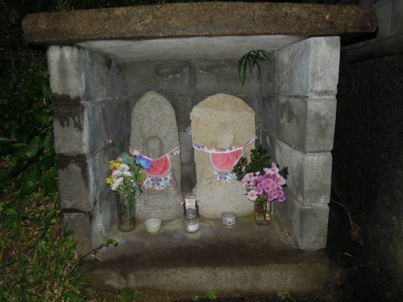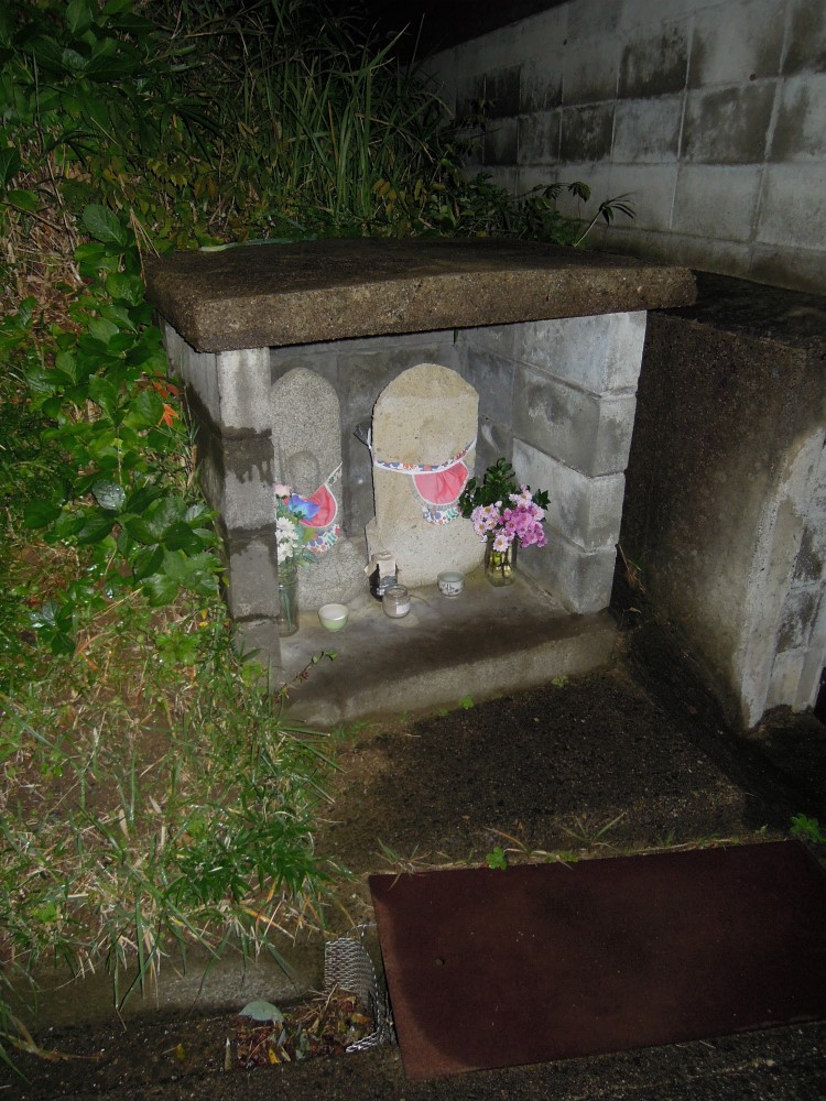 今日も丹後の三津のお地蔵さんをお届けいたします。坂道沿いの崖の下に祠が作られていました。ここから海がちらりと見えます。夜だったので真っ暗闇しか見えませんが・・・。