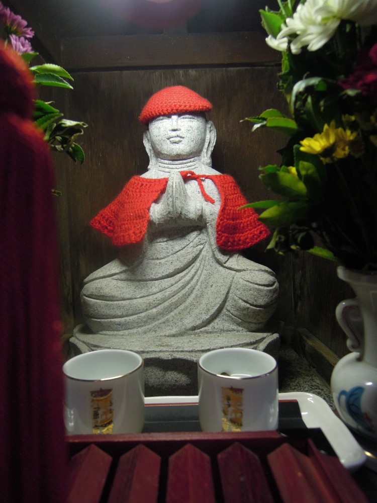 中のお地蔵さんは手編みの帽子におべべですがな。気持ちもほっこりしますねえ。