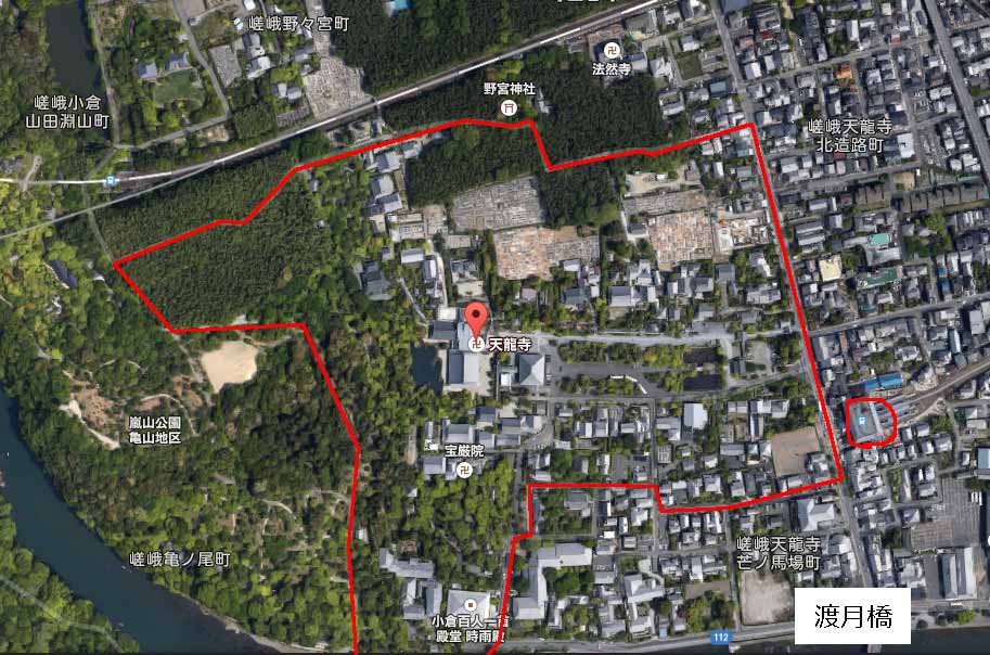 ざっくりですが、天竜寺のあたりを赤でくくってみました。右端の丸は京福電気鉄道の嵐山駅でございます。ローカル感のあふれる良い路面電車です。