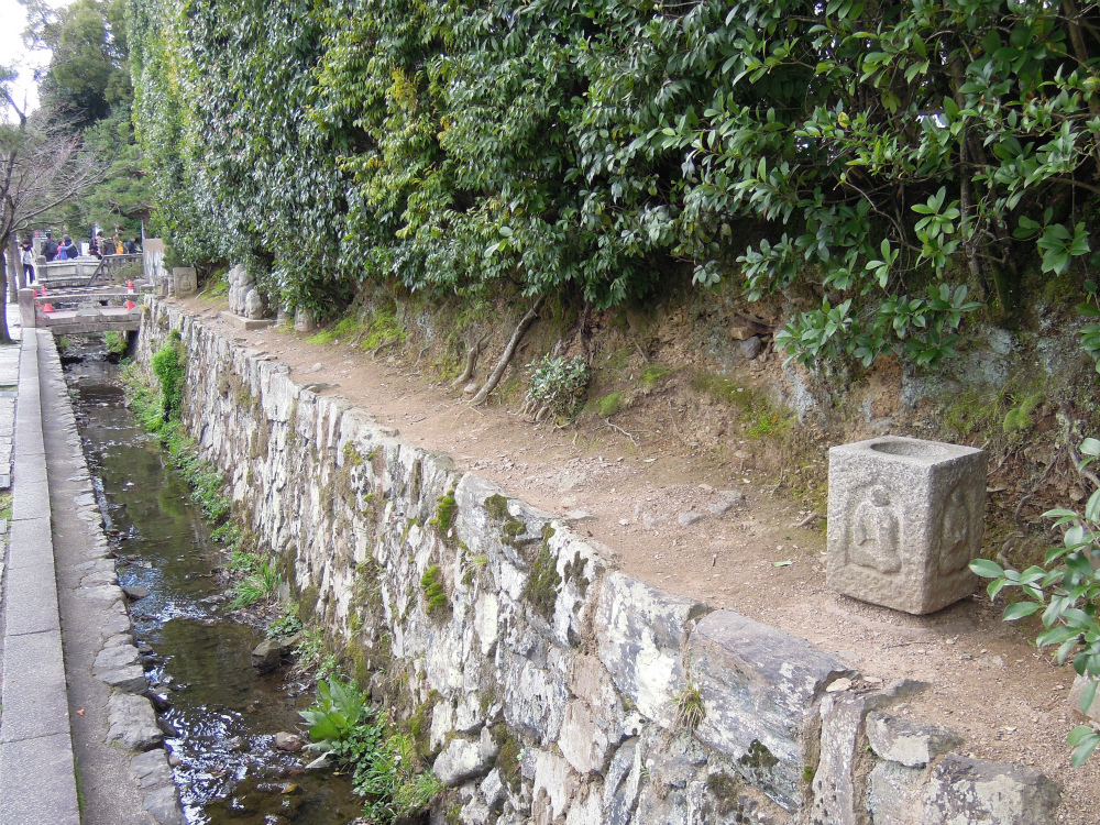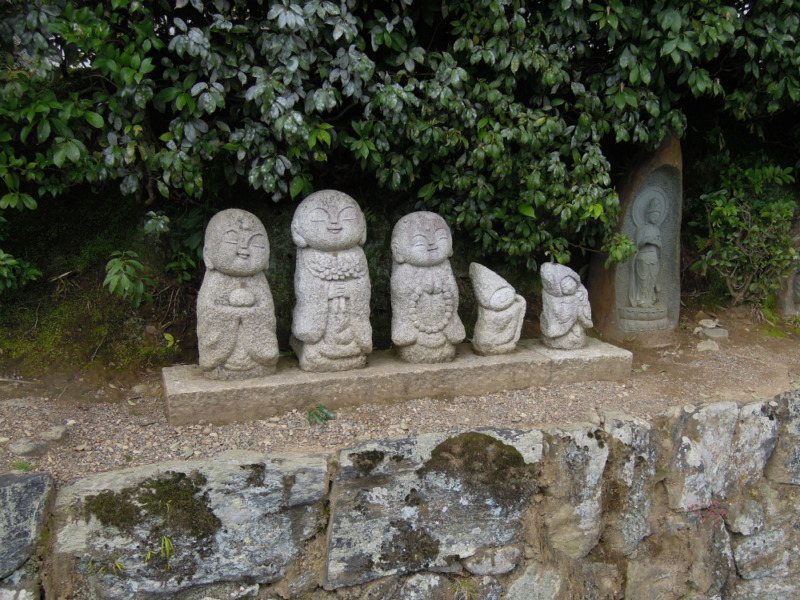 このお寺の中には金襴地が沢山あるのに・・・写真を撮れなかった私は、天竜寺の外側、渡月橋へと続く道沿いに現代風の可愛らしいお地蔵さんを発見しました。五地蔵?いや、右の観音様と合わせて六地蔵・・・?しかしどうみても観音様っぽいな・・・。可愛らしいお地蔵さんを集めたのでしょう。