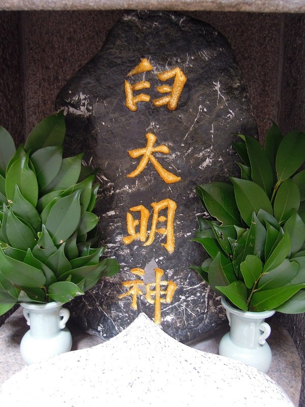 「臼大明神」と書かれた石と、その下に「目なしの下臼」が祀ってあります。「目なしの下臼」というのは普通の石臼(この場合は餅つきに使う木臼ではなく、石臼)には細かく挽いたものを通す為の溝があるのですが、その溝のないつるつるした臼の事です。つるつるした臼はより細かく挽けるのでしょうか・・・?石臼はつかった事ないしなあ。全然解りません。