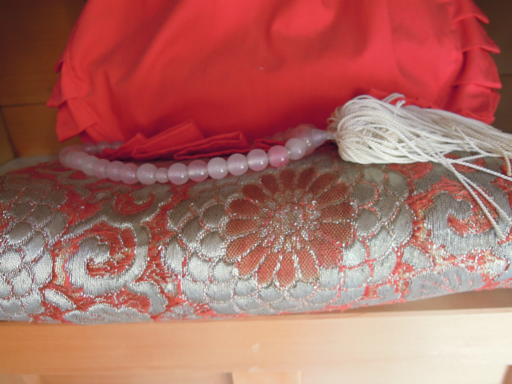 さあ、金襴発見です。お地蔵さんのお座布団。菊桐唐草かしら。可愛らしいお数珠もあるのでお参りのときにお借りしても良いのだと思います。
