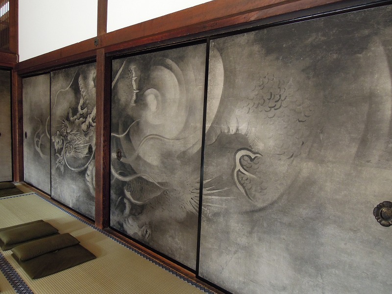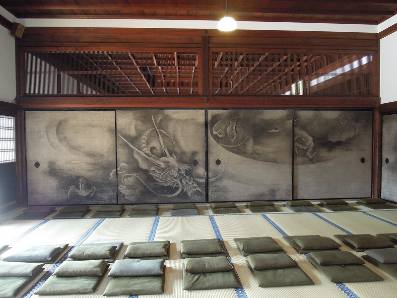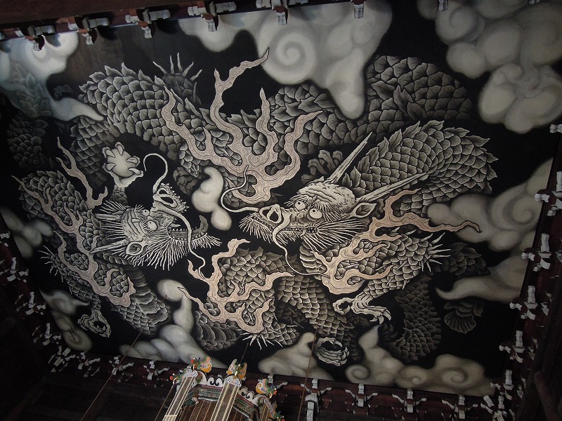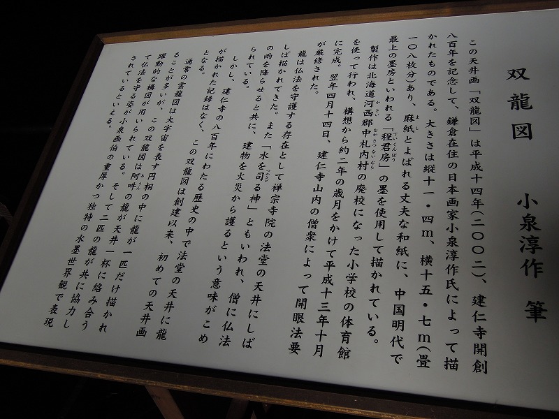↓竜の天井図。写真で見ると「ふ~ん」と思いますが是非、実物をご覧ください。素晴らしい!浮き出てくるようです。「双龍図」こちらは新しい絵です。平成14年(2002)に建仁寺創建800年を記念して描かれました。日本画家の小泉淳作画伯が水墨でかかはりました。約2年かけて取り組まはったそうで畳108畳にも及ぶ大きさ。まさに圧倒されてしまいました。