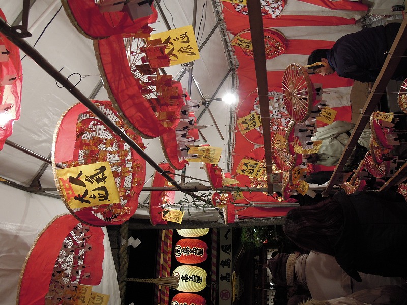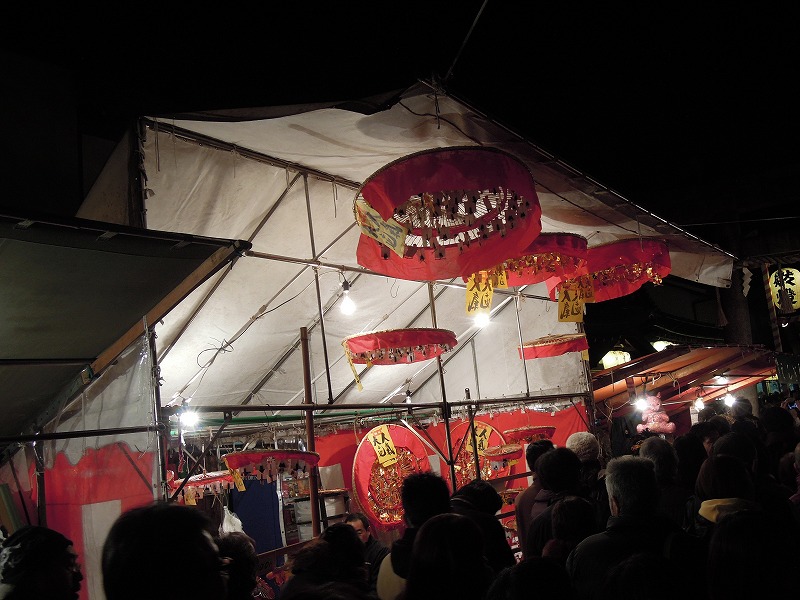 出てきました。笠!熊手!これに縁起物を沢山つけてもらって一年間商売繁盛の神様にお商売を守ってもらうのです。