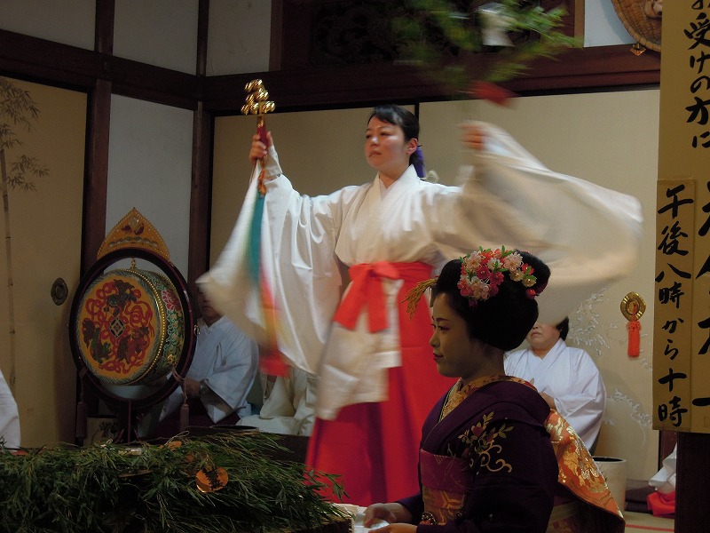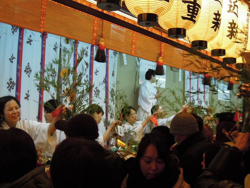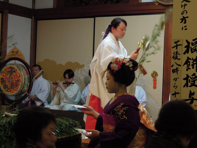福笹をかわはった人は「残り福」にて舞妓さんにお餅を頂けます。後ろには笹に祈祷する巫女さん。
