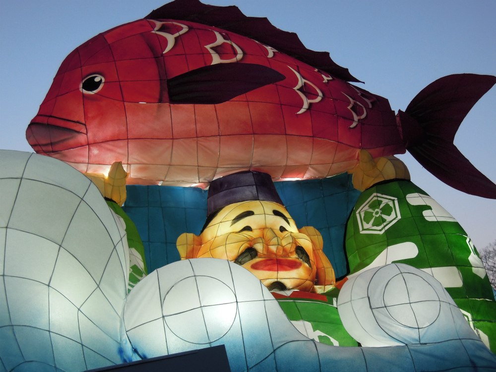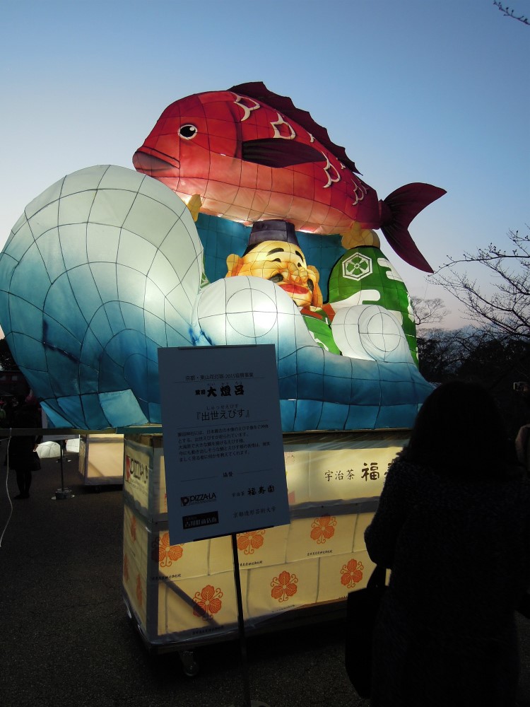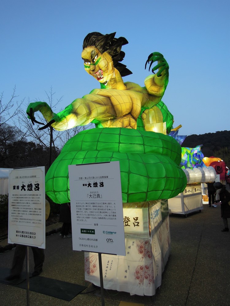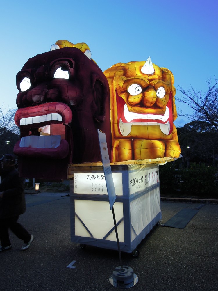 織田信長を討った三日天下の明智光秀。たぶん、むちゃくちゃ賢い人だったんですよ。だけどいろいろあったんでしょうね・・・。とにかくこの顔色の悪い人は明智光秀だそうです。粟田神社近辺には光秀の足跡も多数あり、首塚も祀られているそうです。それで光秀の怨霊をはじめ、さまざまな災害を狛犬が押さえ込んで粟田神社を守り長く栄え平和に繁栄していくようにと言う願いをこめた大灯呂だそうです。