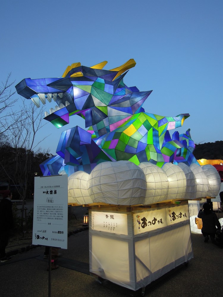 ↑青龍 昔、平安京は四神相応の都と言われていました。その四神の中でも青龍は粟田神社の位置する東を司っています。粟田神社は「旅立ちの守護」「旅行の安全」として信仰されてきた事から新しい出会いや展開を求めていくと言う意味を米現代風の青龍を作り上げたそうです。