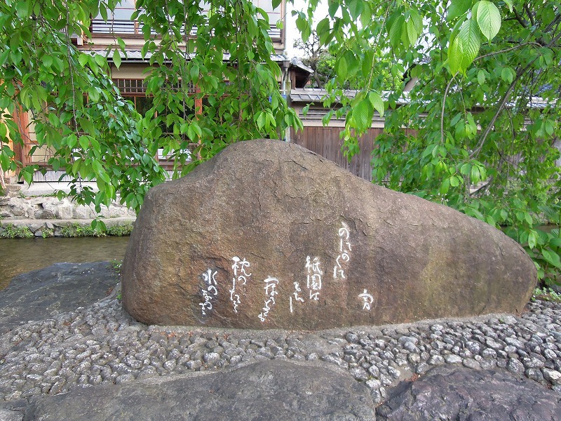「かにかくに 祇園はこひし寝(ぬ)るときも 枕のしたを水のながるる」の石碑です。吉井勇という大正・昭和期の歌人、脚本家で石川啄木などと、あの有名な「スバル」を編集してはったお人です。その方が詠んだ歌。