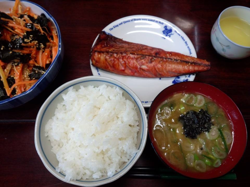 今日の織屋の賄いは、さばの味醂干し、納豆汁、ニンジンの塩もみでございました。