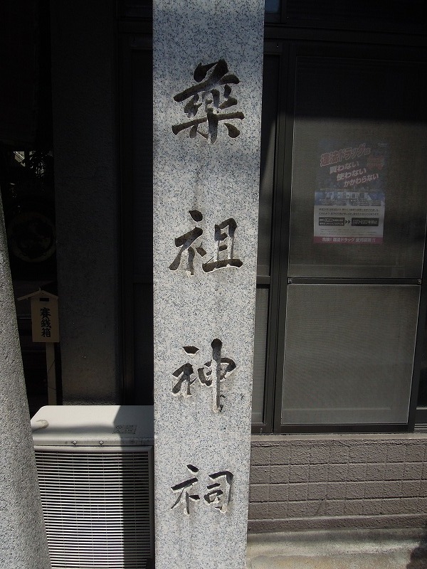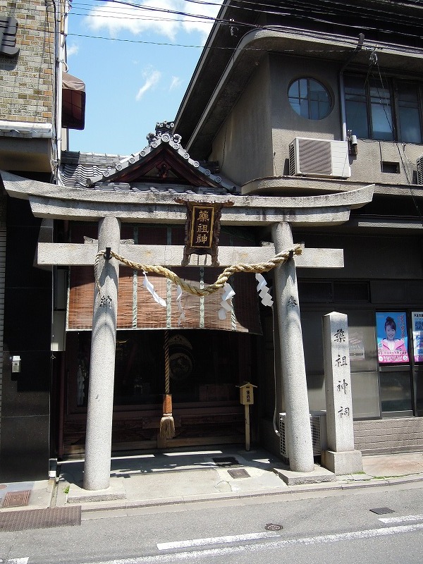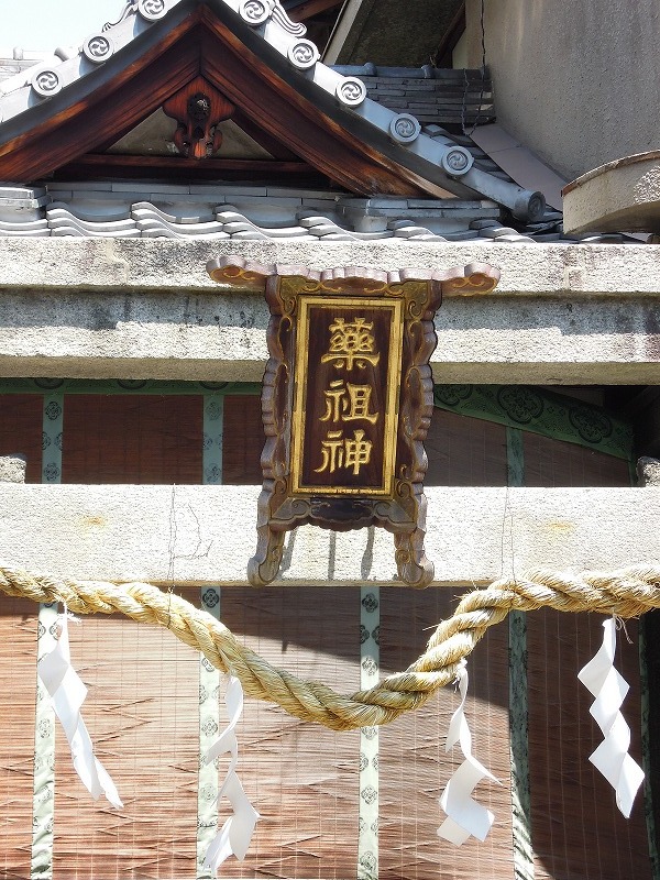 こちらの薬祖神祠は江戸時代後期の二条通の薬問屋さん達が創建しはった神社で、漢方医療の祖とされる中国の神農(しんのう)、日本の薬の神とされる少彦名命(スクナビコナ)、大己貴命(おほなむち)と、古代ギリシャの医師で西洋医学の祖とされるヒポクラテス(こちらは欧州からも薬を輸入するようになっていたため、西洋の神様も必要とヒポクラテスを祖神に加えはったそうです)、がまつられています。