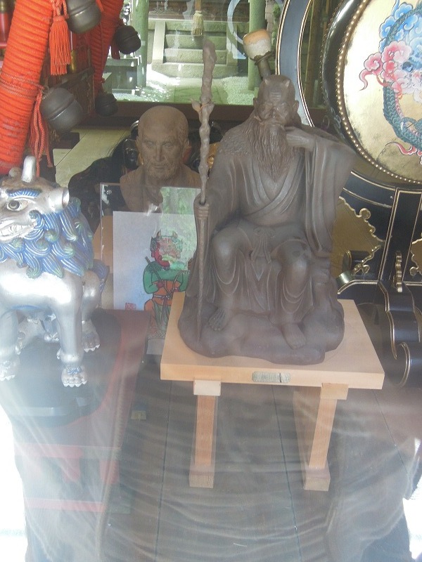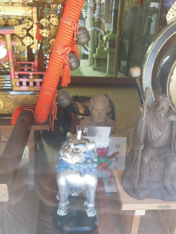 こちらの木彫は薬の神様でしょうか。杖を持った方は神農さんでしょうか。現在保管されている神農像(この写真の像かどうかは不明)は、宇治市の黄檗山万福寺(おうばくさんまんぷくじ)の中国・明出身の隠元が持ち込んだものとされ、一八五八年のコレラ流行の時も、悪疫をはらったと伝わる。